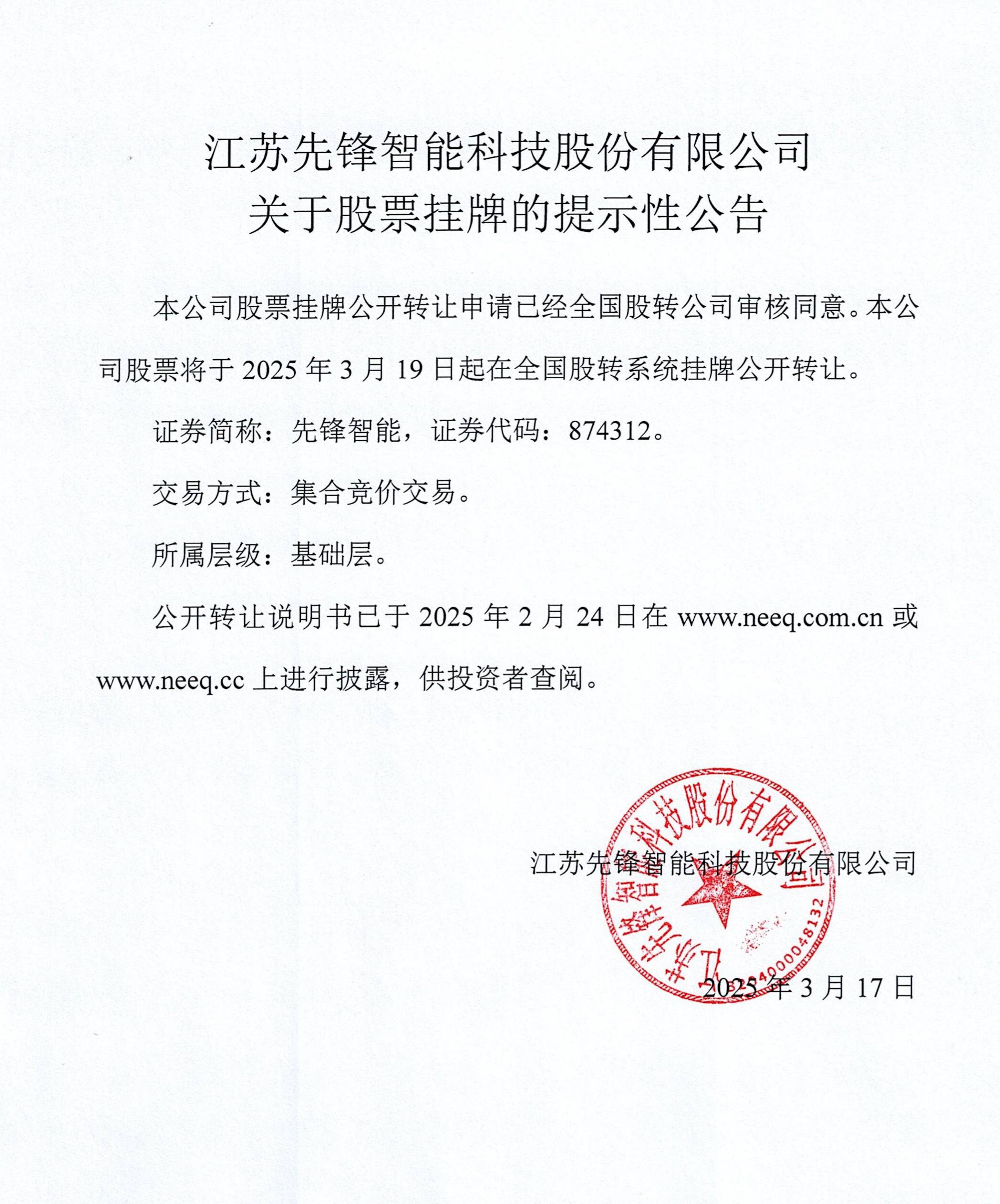 2025年03月19日,江蘇先鋒智能科技股份有限公司(證券簡稱:先鋒智能,證券代碼:874312)在全國中小企業(yè)股份轉(zhuǎn)讓系統(tǒng)(新三板)鳴鑼掛牌,這座矗立于長三角經(jīng)濟(jì)帶的工業(yè)智造標(biāo)桿企業(yè),在歷經(jīng)廿八載春華秋實(shí)后開啟資本賦能新篇章。從"制造"到"智造"的躍遷之路上,始終閃耀著技術(shù)創(chuàng)新的熠熠星光。此舉既為廿載躬耕的里程碑,也是智造征途的新起點(diǎn),彰顯“中國干燥技術(shù)領(lǐng)航者”的硬核實(shí)力。